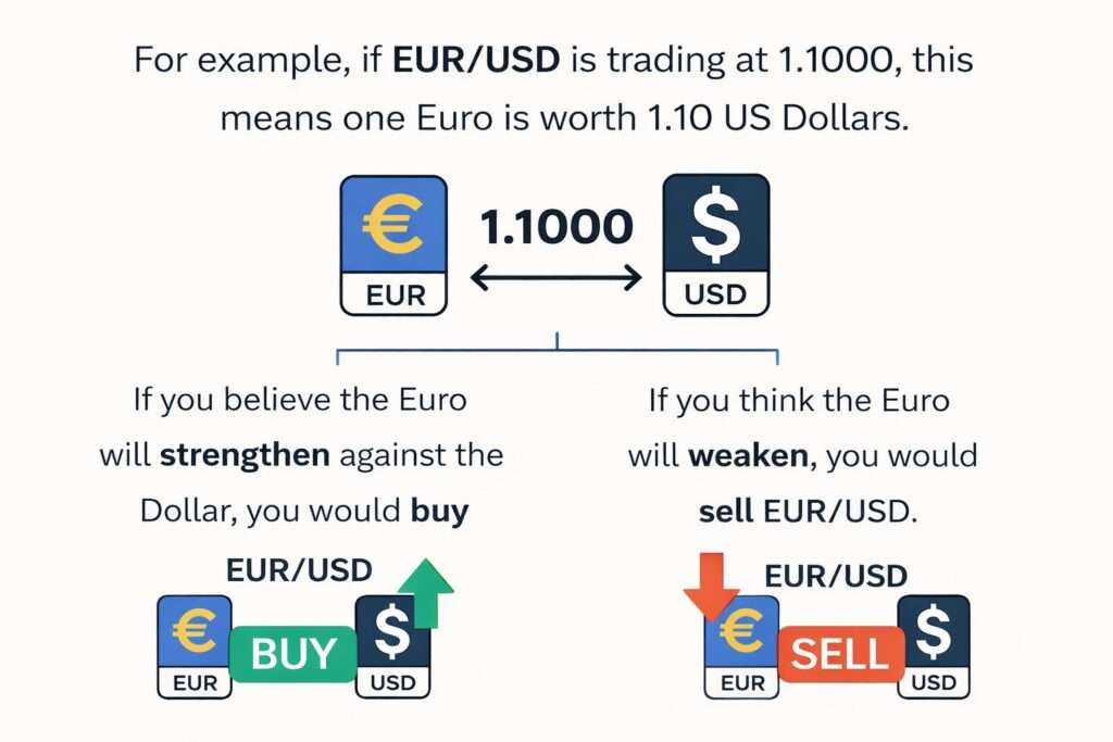 For example, if EUR/USD is trading at 1.1000, this means one Euro is worth 1.10 US Dollars. If you believe the Euro will strengthen against the Dollar, you would buy EUR/USD. If you think the Euro will weaken, you would sell EUR/USD.